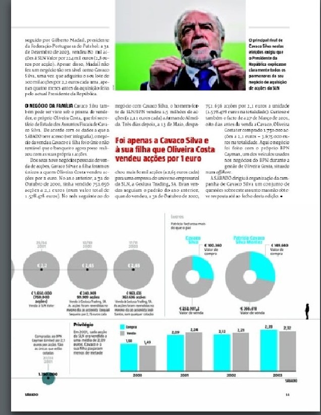 Os mais distraídos certamente não se lembram mas a verdade é que não foi apenas Rui Machete a adquirir acções da SLN a um preço pornograficamente baixo. Cavaco Silva também o fez. O amigo Oliveira e Costa, que ele levara para o seu Governo, vendeu-lhe – a ele e à sua filha Patrícia – um lote de 250 mil acções a metade do preço a que estavam a ser vendidas ao comum investidor. Entre a data da aquisição e a da venda as acções valorizaram 140%. Espectacular. Leiam com a reportagem que a Sábado publicou sobre o tema – um trabalho mais vasto, da autoria de António José Vilela, que fala de um crédito concedido pelo BPN ao genro de … Cavaco Silva – e digam lá que não queriam amigos destes.